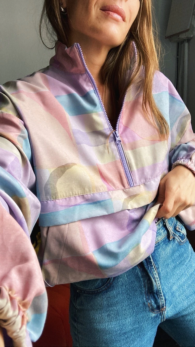 Buzo tipo anorak con cuello semi alto de 5 cm y cierre delantero de 30 cm.