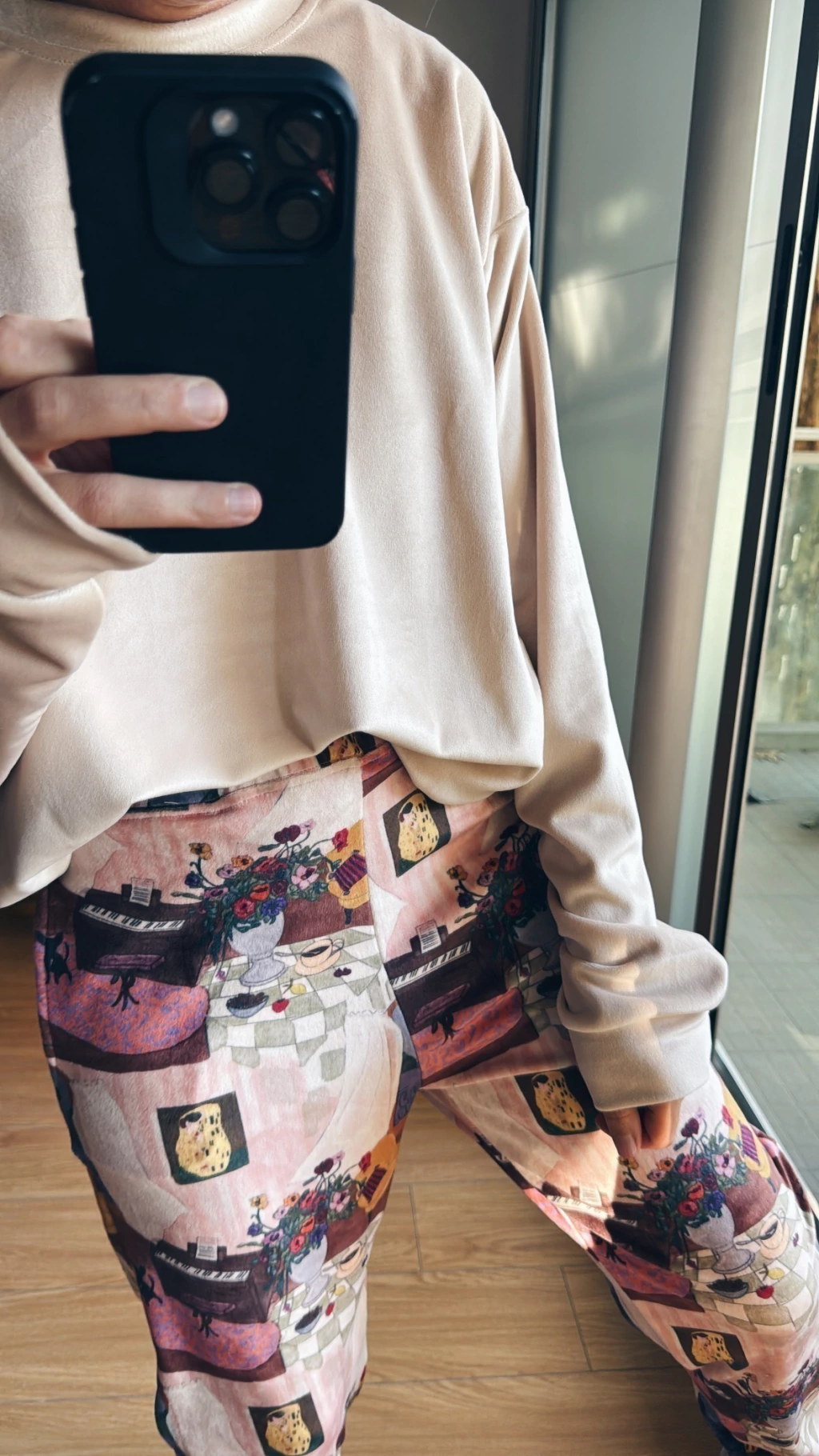 Pantalón confeccionado en plush acabado velvet, estilo jogger (o jogging).